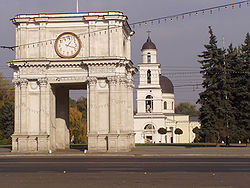 Триумфальная арка и православный кафедральный собор в центре КишинёваПосле распада Советского Союза, наметилась тенденция к изменению названий населённых пунктов Молдавии, в частности, началось активное внедрение слова «Кишинэу» в русский язык. В современной Молдавии это название часто используется как в официальных, так и в неофициальных документах на русском языке.[4] Однако, по правилам русского языка, город называется Кишинёв. [5]