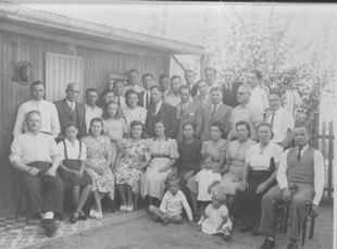 Особенно в этом отношении отличалась белорусская диаспора. В 39 году ее культурно-просветительские организации объединились в Федерацию белорусских обществ. Многие переселенцы из западной Белоруссии являлись членами профсоюза и Компартии Аргентины. Белорус Семен Николаевич Витковский имел в центре Буэнос –Айреса каменный дом, работал механиком. Являлся активным членом белорусского клуба «Беловежа». На улице Парагвай, 2343, куда к мужу переехала Иустиния с детьми, часто собирались члены клуба. Под видом семейных вечеринок они на этих сходках обменивались свежими новостями с фронтов, писали листовки,собирали вещи для посылок,которые через Красный Крест отправляли в Союз. Многие женщины покупали новые детские вещи, немного их “старили”, чтобы те имели поношенный вид. Иустинии привозили уже раскроенную ткань и она по ночам шила белье для солдат. Одна из таких сходок в доме Семена Николаевича (сидит первый слева) запечатлена на фотографии 1943 года, которую Глория – Лина хранит более 60 лет. На снимке она в белом платьице стоит рядом с мамой…