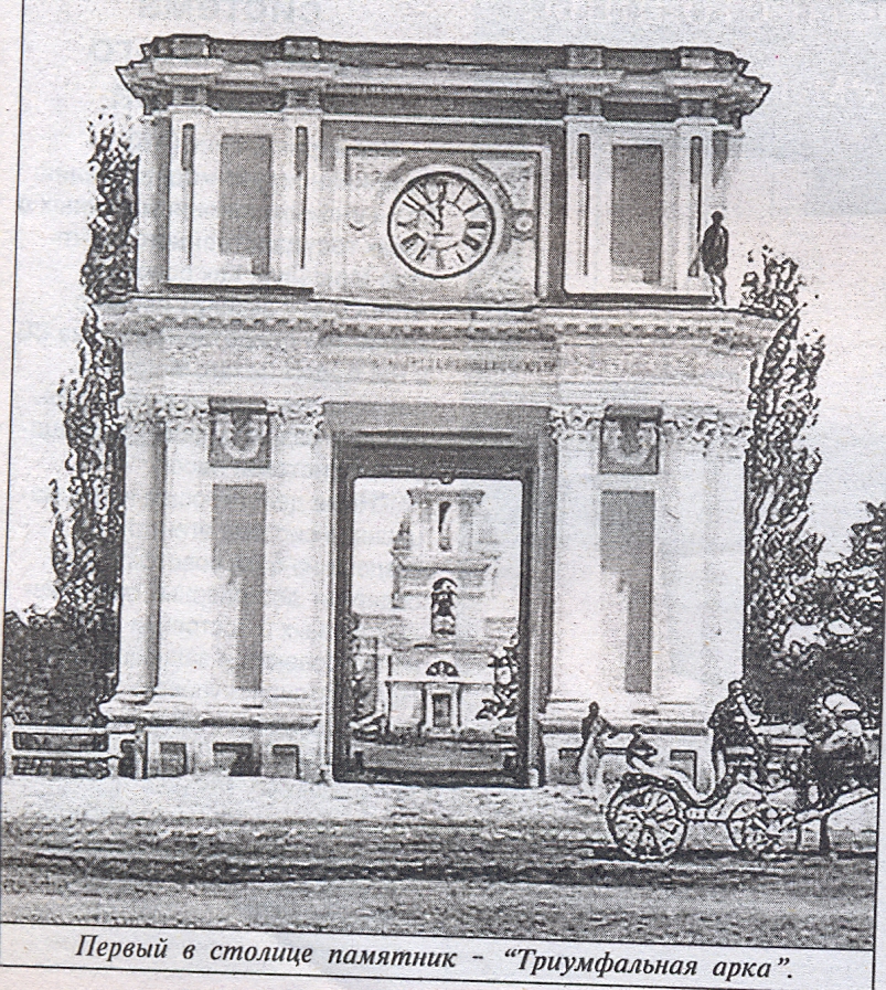“Соборная” площадь (она еще называлась “Плац-парадной”) формировалась, как главная в Кишиневе. Застройка центрального ядра города велась в различные годы. На противоположных его сторонах высились здания Кафедрального собора с колокольней и митрополией. Именно здесь, в 1840 году появился первый в столице памятник – “Триумфальная арка”, воздвигнутая как символ победы России над Османской империей.