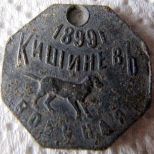 Номерной жетон кишинёвской собаки. На этом жетоне указано, что собака – военная. Жетон свидетельствовал, что собака не бродячая, и что налог за неё уплачен (в данном случае – на 1899 год). В частности, из этих налогов и финансировалась борьба с бродячими собаками в городах Российской Империи.