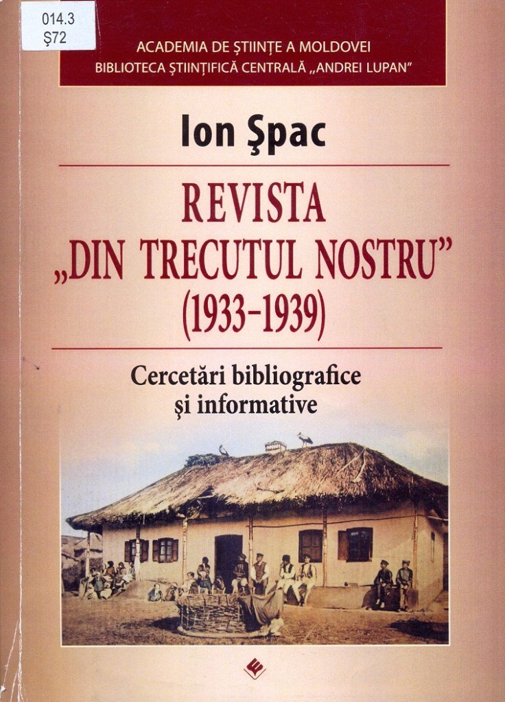 Șpac, Ion. Revista „Din trecutul nostru” (1933-1939) : Cercetări bibliogr. și informative / Ion Șpac ; coord. șt. : Aurelia Hanganu ; red. bibliogr.: Diana Rotaru ; Acad. de Științe a Moldovei, Bibl. Șt. Centrală „Andrei Lupan”. – Chișinău : S. n., 2013. – 216 p.