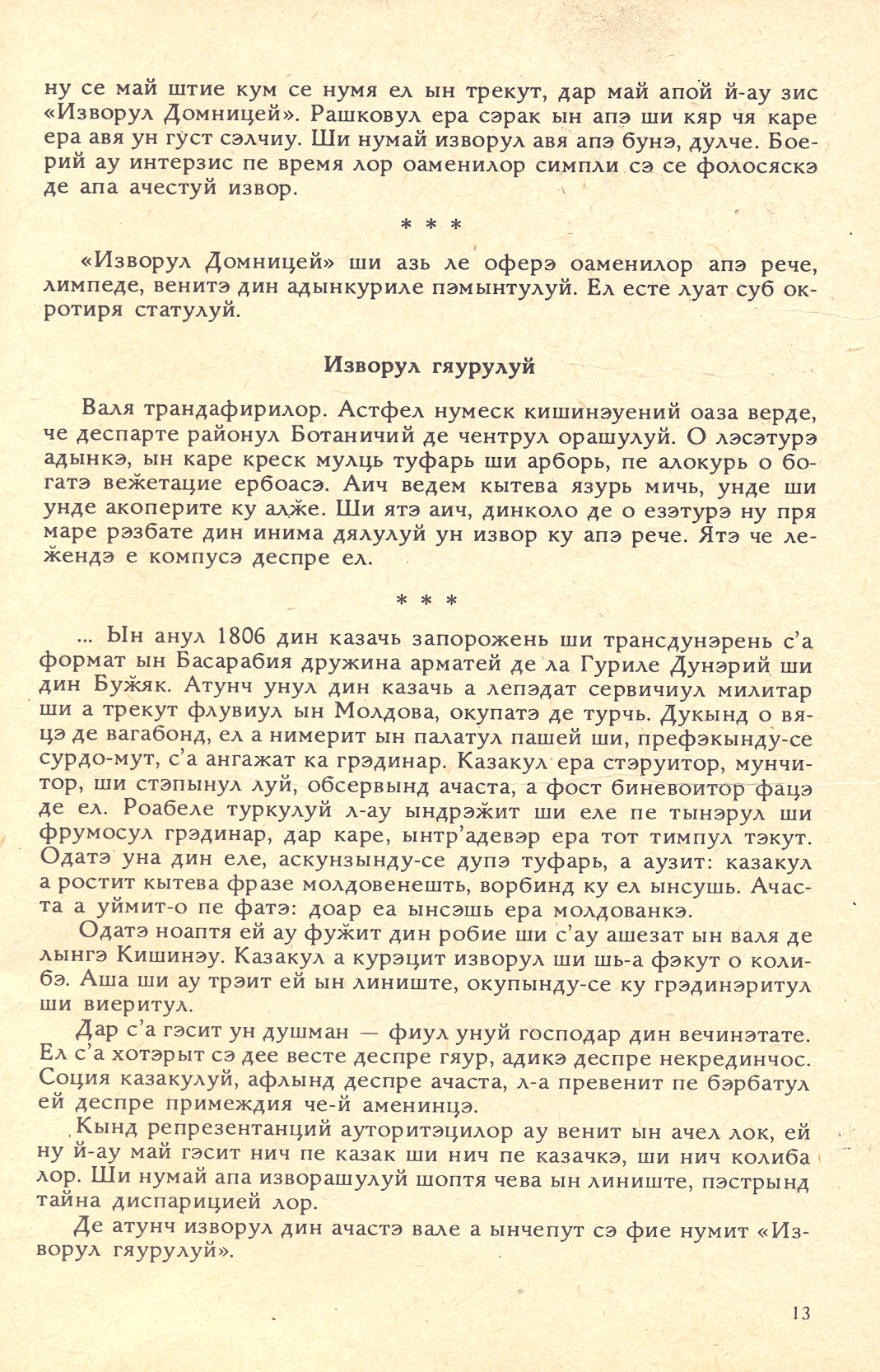 …În anul 1806 din cazacii zaporojeni și transdunăreni s-a format în Basarabia drujina armatei de la Gurile Dunării și din Bugeac. Atunci unul din cazaci a lepădat serviciul militar și a trecut fluviul în Moldova, ocupată de turci. Ducând o viață de vagabond, el a nimerit în palatul pașei și, prefăcându-se surdo-mut, s-a angajat ca grădinar. Cazacul era stăruitor, muncitor și stăpânul lui, observând aceasta, a fost binevoitor față de el. Roabele turcului l-au îndrăgit și ele pe tânărul și frumosul grădinar, dar care, într-adevăr era tot timpul tăcut. Odată una din ele, ascunzându-se după tufari, a auzit: cazacul a rostit câteva fraze moldovenești, vorbind cu el însuși. Aceasta a uimit-o pe fată: doar ea însăși era moldoveancă.