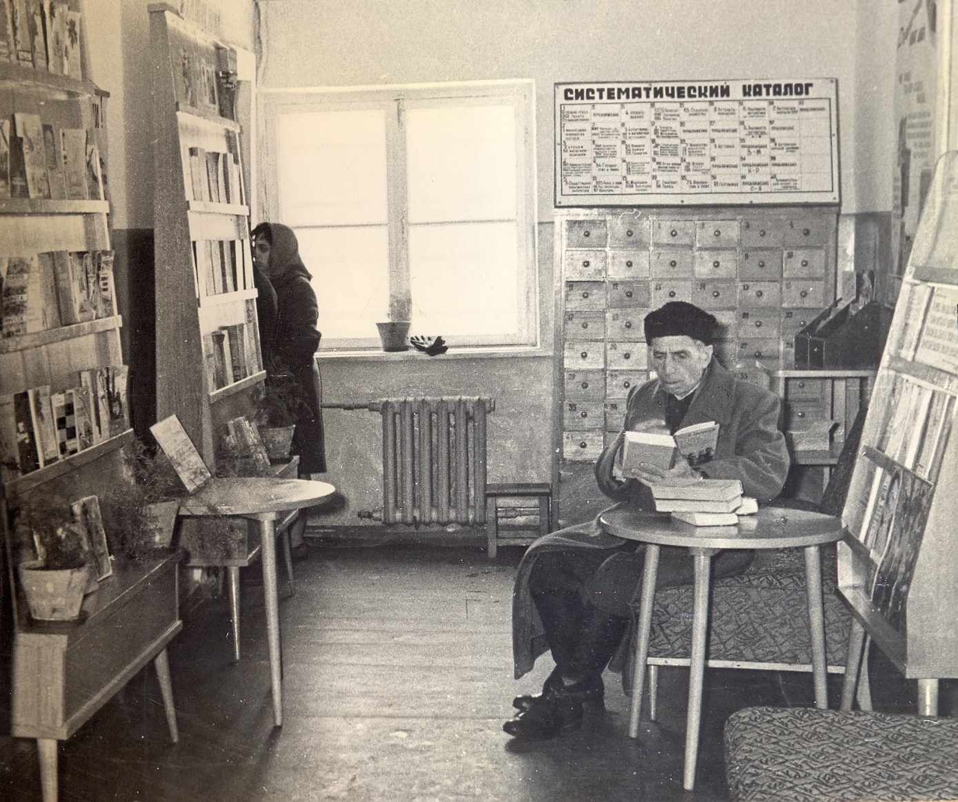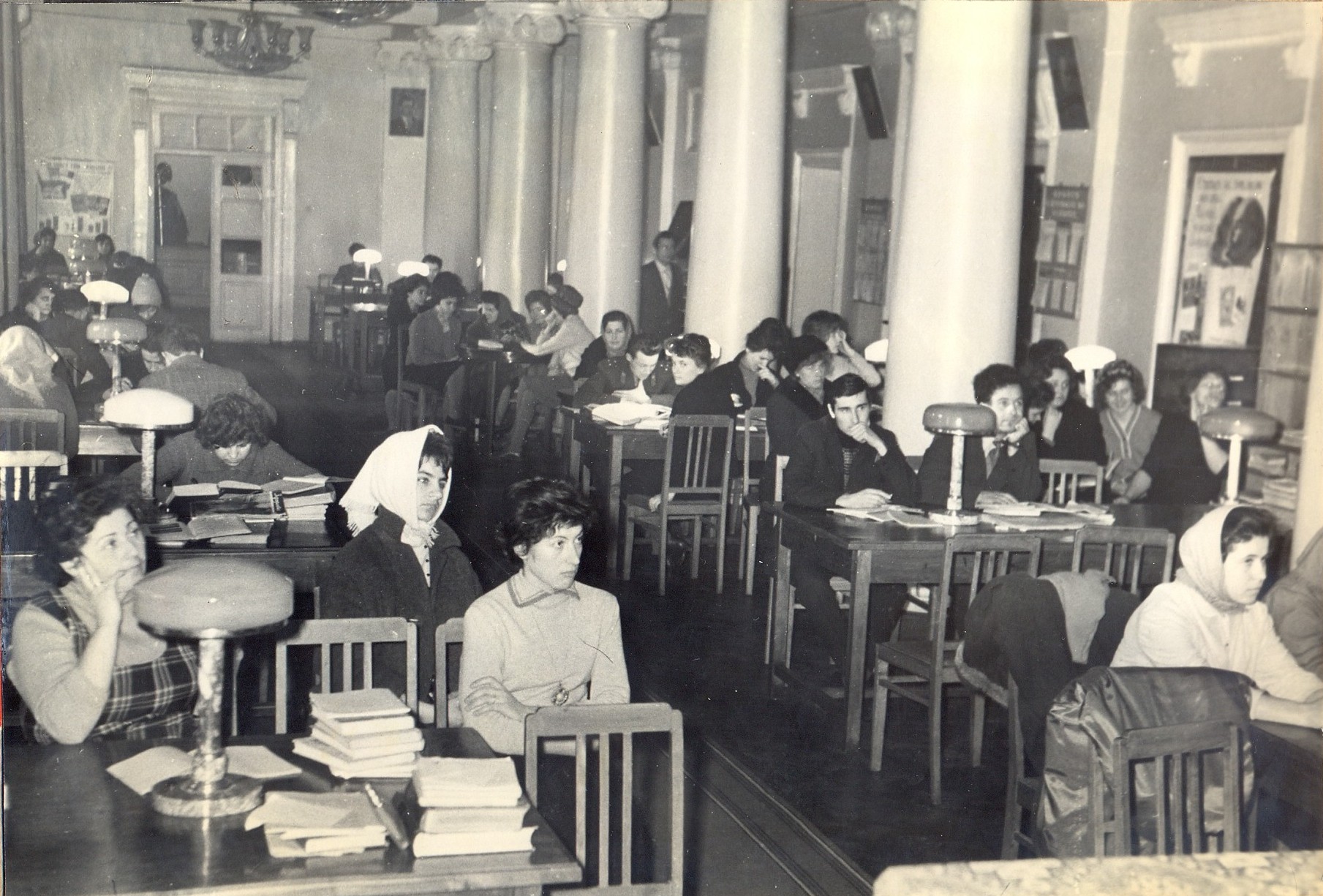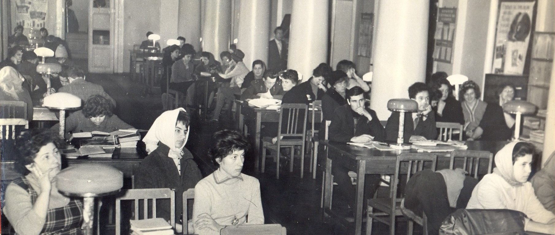 Prima fotografie înfățișează clădirea bibliotecii din afară, în fotografia numărul doi este Sala de lectură plină ochi cu cititorii vremii, iar fotografia numărul trei ilustrează secția Abonament.