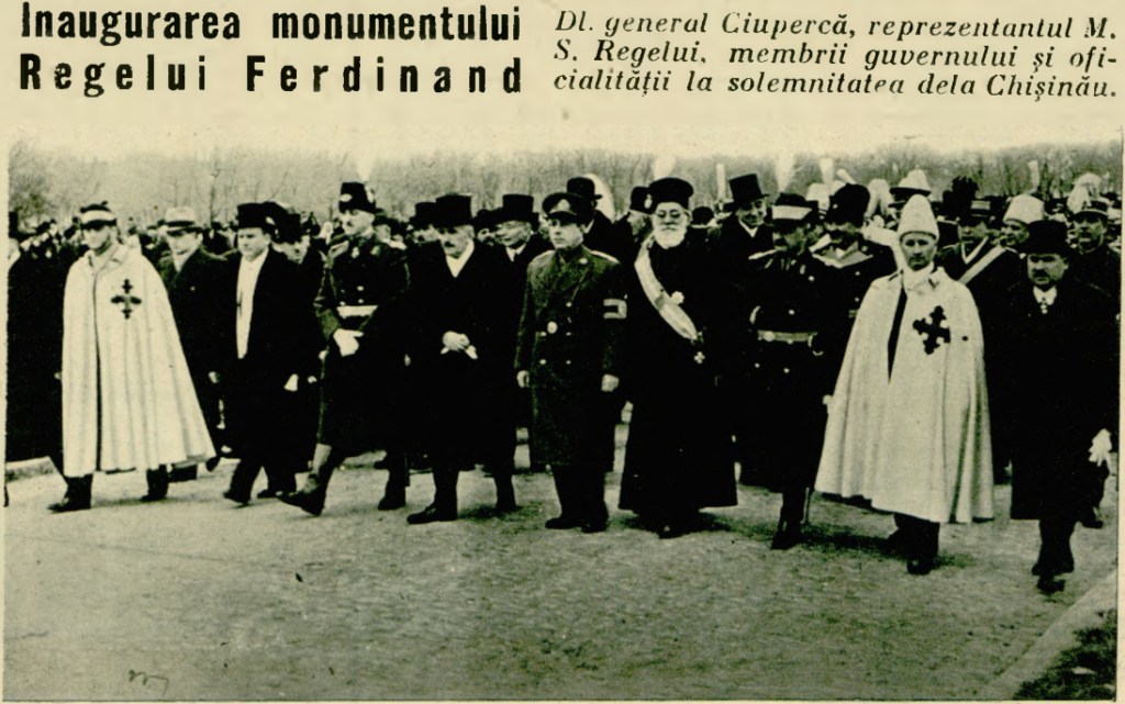 La 5 februarie 1939, în prezența reprezentantului la Chișinău al M.S. Regelui Carol II-lea, general Nicolae Ciupercă (fost ministru de război, inspector general al Armatei Române), a trei miniștri din Guvernul României și a delegaților ofi ciali ai mai multor provincii românești, a fost dezvelit monumentul Regelui Ferdinand I (sculptor Oscar Han), care era „o pildă de pioasă recunoștință în amintirea Regelui țăranilor, pe care i-a înstăpânit în brazda lor strămoșească și totodată un simbol de neclintită credință în veșnicia pietrei de hotar așezată la granița Nistrului Românesc”.