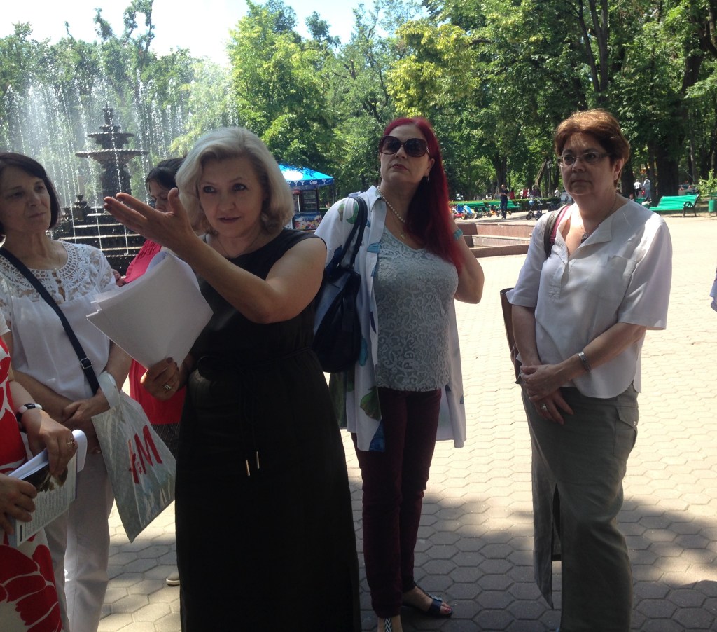 Далее маршрут был проложен в Публичный сад Штефана чел Маре, с его почти 200- летней историей, ребята, и их мамы, учителя открыли для себя много интересного о том, как появился в городе бюст А.С. Пушкину, об Аллее классиков, скульпторах создавших бюсты, о небольших их «секретах». Ребята и взрослые с удивлением узнали, что решетка парка оригинальная, изготовлена в Одессе из трофейных пушек по настоянию архитектора Ал. Бернардацци. Мы поговорили о загадочной истории появления в парке скульптуры двух львов, о действующих и заброшенных фонтанах, взрослые вспомнили и о кафе «Сказка», а заодно и обо всех кафе города, где можно было поесть вкусное мороженное. На выходе из парка ребята узнали, что кинотеатр «Патрия» там был не всегда, что на этом месте ранее находится Английский клуб, затем здание Благородного собрания, клуб, где собирались бессарабские дворяне.
